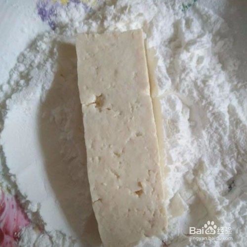 把豆腐切成宽条,再把豆腐4面均匀的粘上淀粉。