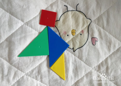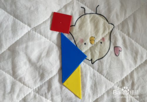 放上上下挨着的蓝色三角形、黄色三角形,如图。