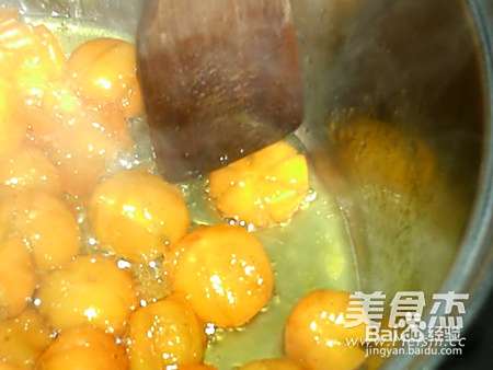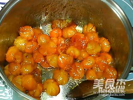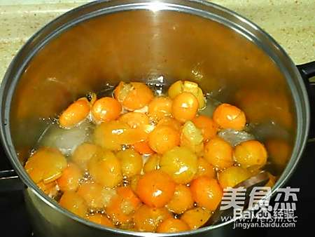 11锅中汤汁减少后,转小火,并用勺轻压金桔,将金桔中的水挤出。
