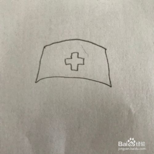 在干净的白纸上画一个梯形的帽子,帽子上面画上十字,见下图