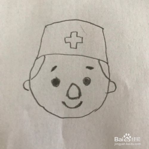 在梯形帽子的下方画出医生圆圆的脸,鼻子,眼睛,眉毛和嘴巴,见下图