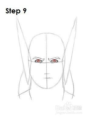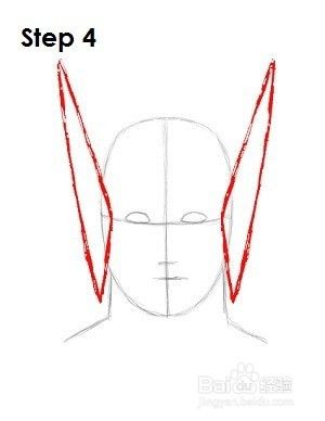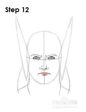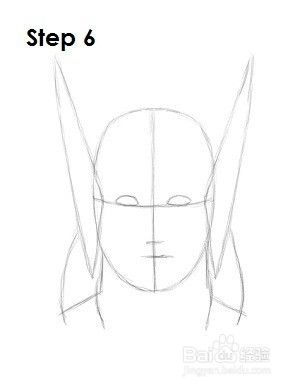 第四步:在水平施工线的两端和头部两侧,画两条长三角形的形状,作为托尔头盔上的翅膀的导向。三角形的大小决定了雷神头盔上的翅膀大小。三角形越长,翅膀就会越长。