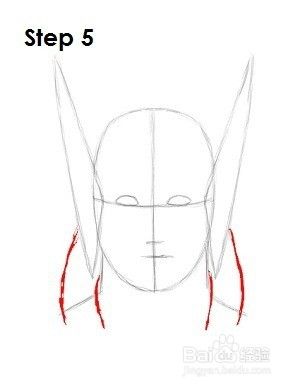 步骤5:在Thor头部的任一侧,在三角形下面,绘制两条弯曲的线,延伸到他的脖子下方作为他长发的指引。