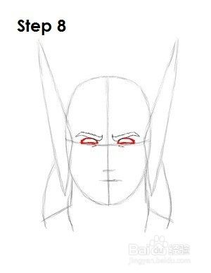 第8步:使用初始形状作为指导,将这个漫威漫画角色的眼睛全部变暗以代表睫毛。将每只眼睛的底部稍微弯曲一下,让他略微眯起眼睛,并在Thor的每只眼睛下方划出一条小线,以获得额外的细节。