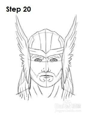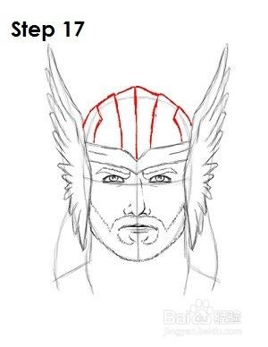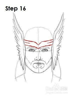 步骤16: Thor的头盔也有不同的变化。这个版本与电影中的相似。首先在Thor的前额上画几条类似于头带的线,以代表头盔的底部。将线条倾斜以在眼睛之间形成V形。