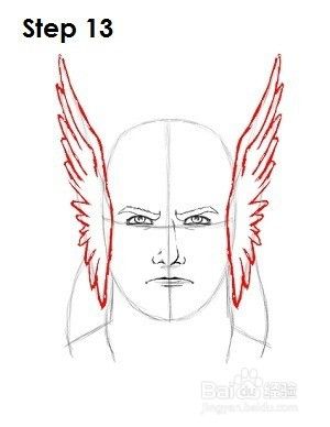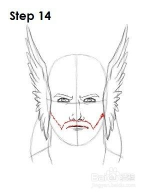 第13步:使用最初的三角形形状作为指导,在Thor头盔侧面的翅膀上绘制。只需在形状内侧添加曲线形成翅膀。羽毛指向上方,逐渐改变方向,最终朝下指向底部。这些可能会非常棘手,所以请使用上面的图片作为参考。Thor的头盔有很多不同的变体,这是其中之一。你可以绘制你喜欢的任何版本。