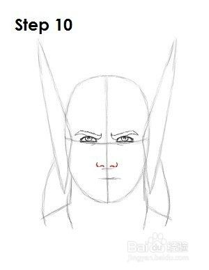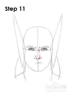 第11步:将托尔的鼻梁画成一条从他的鼻孔到眼睛之间的垂直线。多画两条线以获得额外的细节。