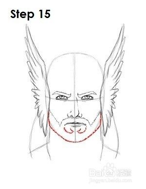 第15步:通过绘制另一条模糊线并以主圈的底部为指导,完成托尔的胡须。将两侧和下巴放在一起以增强下颚的形状,并且不要忘记使用快速短行程。如果你宁愿托尔没有胡子,那么不用短暂的快速划动就能画出他下巴的下半部分,让他看起来干净利落。