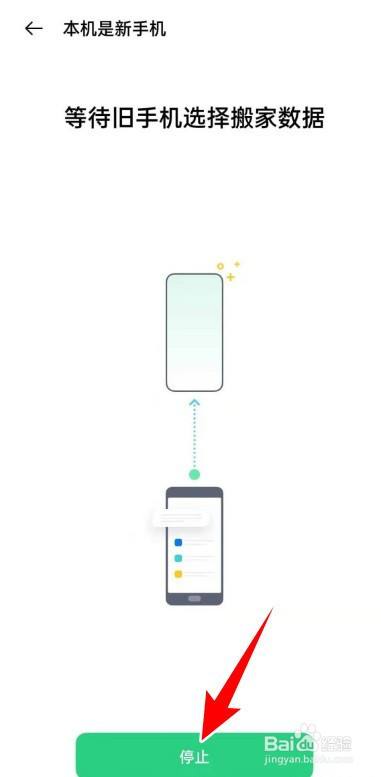 在等待页面,旧手机数据迁移到新手机,点选停止可立即中断;