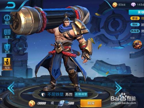 苏烈是长城守卫军的坦克英雄,负责抵挡攻击。虽然定位是坦克类英雄,但是苏烈本身也有不俗的控制和伤害,他的被动技能也让苏烈拥有极强的单挑能力。有时苏烈也被用来作为战士和打野使用,效果也是很好的。推荐装备:红莲斗篷,黑切,复活甲。