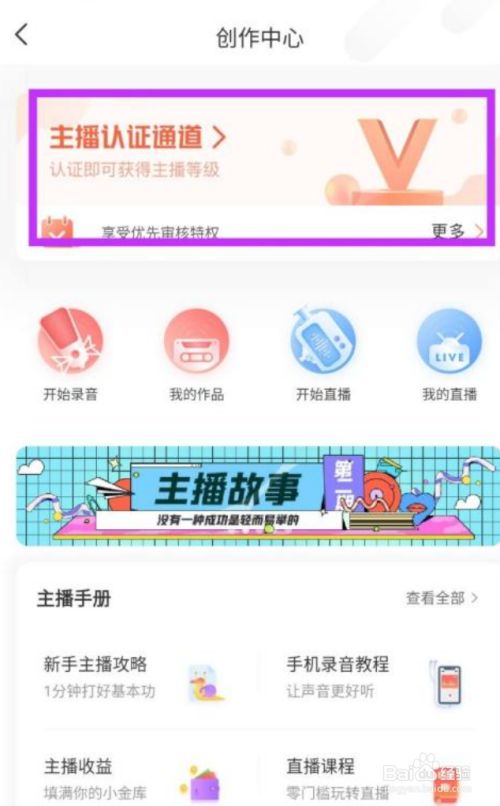 进入创作中心后,页面里有一个主播认证通道,进入通道