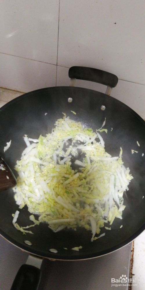 锅里油热加葱花爆香,倒入白菜丝翻炒