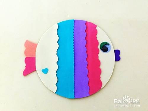 小鱼的身体粘好后,用剪刀沿光盘形状把多余的海绵纸部分剪掉。为小鱼粘上眼睛。
