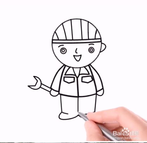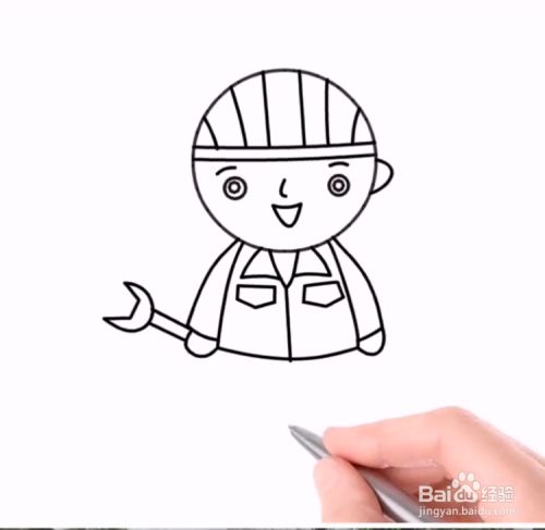 再画出工人的双臂和双手,以及手里的扳手,如下图所示。