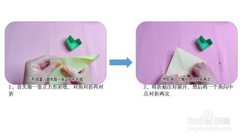 首先取一张正方形彩纸,对角对折再对折,将折痕压好展开,然后将一个角向中点对折两次。