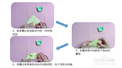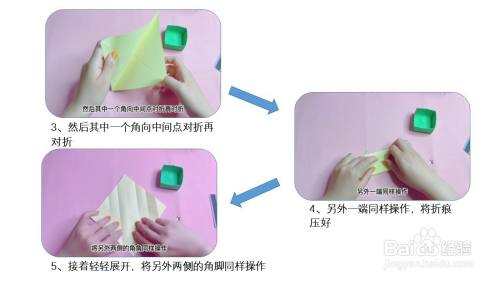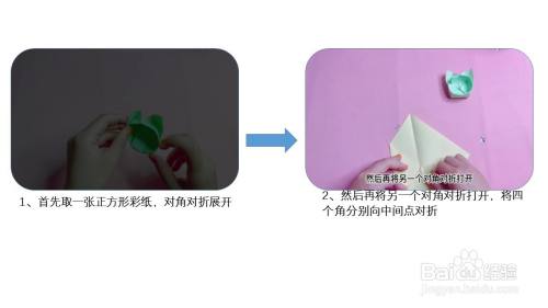 首先取一张正方形彩纸,对角对折展开,然后再将另一个对角对折打开,将四个角分别向中间点对折。