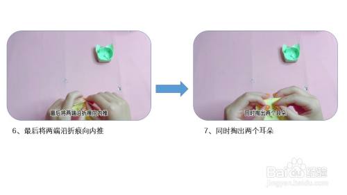 最后将两端沿折痕向内推,同时掏出两个耳朵。