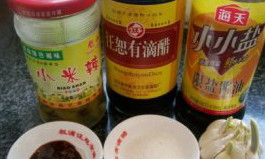 将蒜切小块,泡椒也分出少许切碎,加入醋、酱油、辣椒油、白糖、泡椒、蒜拌匀