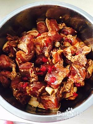 提前一天把五花肉切块,用盐、料酒、生抽、蚝油、干辣椒、(可以再加点老抽提色)、姜汁姜片、蒜瓣腌制一天,始肉充分入味
