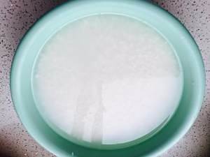 包粽前两小时用凉水浸泡糯米,利用浸泡糯米的时间,咱们就可以把提前一天泡软的粽叶进行清洗,用一海绵刷一张张清洗,正反两面都要清洗,清洗完剪去粽叶的硬梗浸泡在清水里备用。