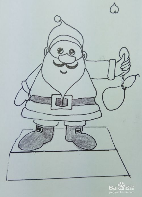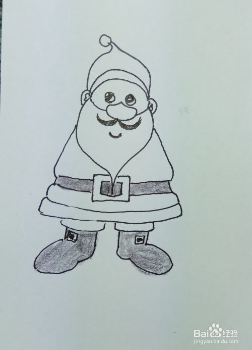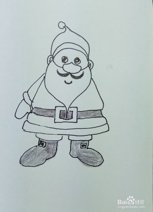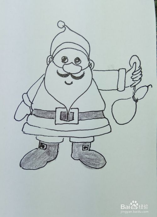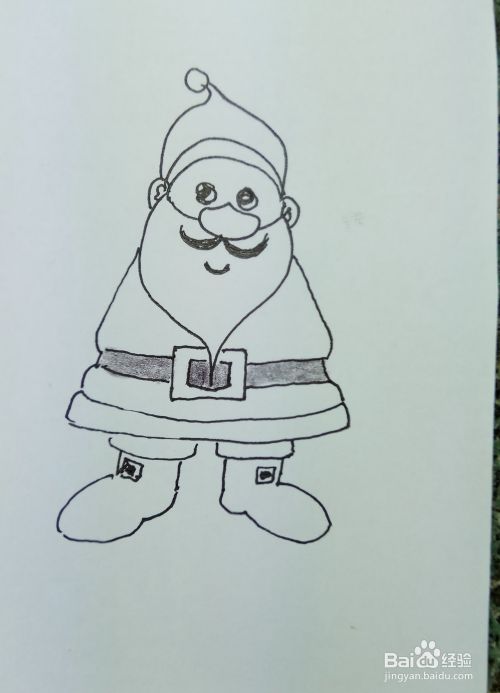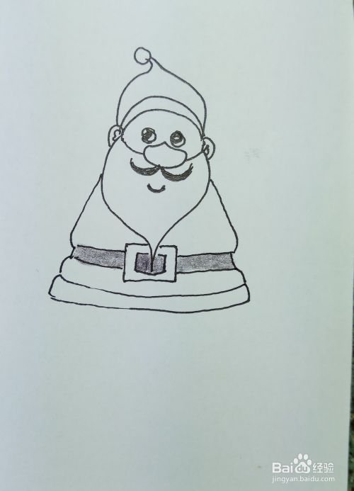 然后用曲线和弧线画出圣诞老人的上半身,并画出他身上穿着的衣服,重点涂出腰带的色彩。