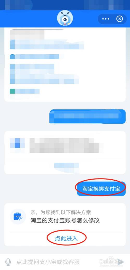 在服务对话框中输入“淘宝换绑支付宝”,在回复的信息中选择“点此进入”。