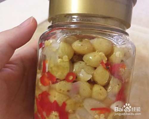 15克鲜指天椒、15克大蒜切碎加入瓶中,再加入20克白糖和10克酒搅拌腌制半个月。
