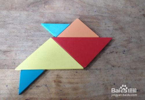 摆上正方形,放在橙色三角形左上挨着,如图。这样就拼组好了。