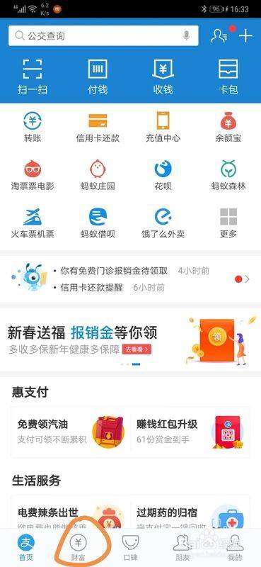 在支付宝应用界面中点击下方的”财富“功能栏。