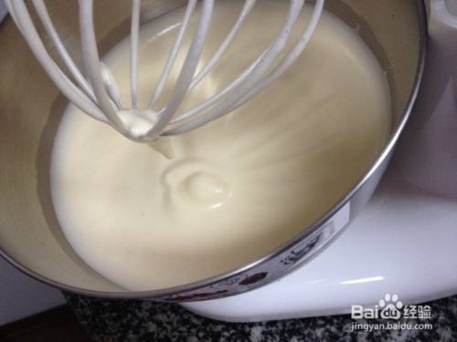 打蛋盆装入厨师机,6档搅打10分钟左右,体积膨胀三倍左右,颜色变浅,提起打蛋头留下痕迹在5秒左右慢慢消失,即打发好了