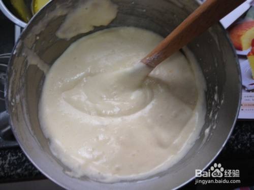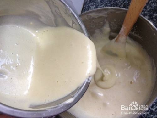 取少部分打发的蛋糕糊倒入牛奶色拉油混合物中,用刮刀拌匀