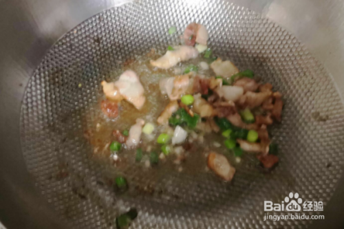 五花肉出油后,放入葱末翻炒,然后再放入小米椒和酸菜一起翻炒。