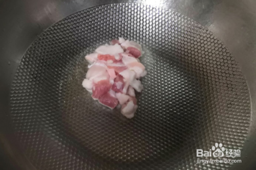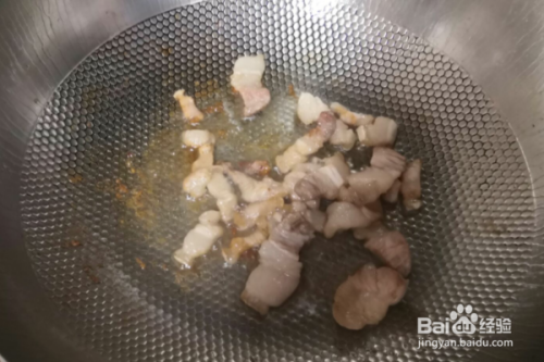开火,锅中放入10克调和油,油热后,放入五花肉进行翻炒。