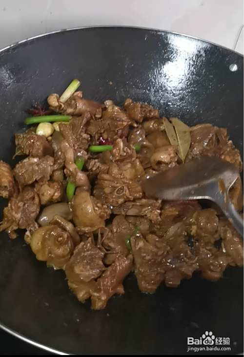 鹅肉煸炒至焦黄后,倒入啤酒,加上准备好的八角、辣椒干、香叶,开大火煮10分钟,后改用小火闷煮1-2小时,(如果汤汁比较多,开大火收干即可)。