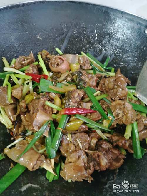 倒入鹅肉煸炒,加入酱油、蚝油、盐、白糖,老抽上色。