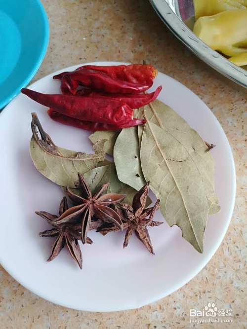准备啤酒、芹菜、生姜、大蒜、八角、辣椒干、香叶等各种配料。