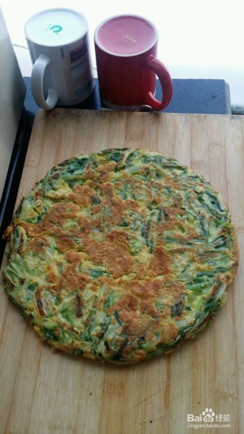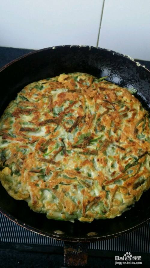煎锅烧热放油,七层热时放入面糊摊平,别太薄呵…