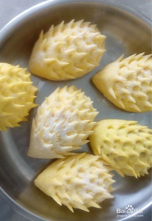 撒些干面粉,将发好的面团揉光滑。将面团揉成长圆条状,用刀分成若干等份。将小面团揉圆,按扁,包入花生酱,搓成一头尖的刺猬形状,然后用剪刀从头部方向开剪,剪出刺猬的刺。然后用芝麻给小刺猬做眼睛。全部做好后,醒发一段时间。