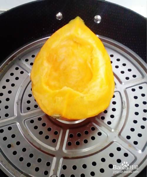将四分之一南瓜洗净,蒸熟后稍微放凉。水开后大概20分钟就可以了,勤快点的可以切的小块一些,更容易熟,嘿嘿。