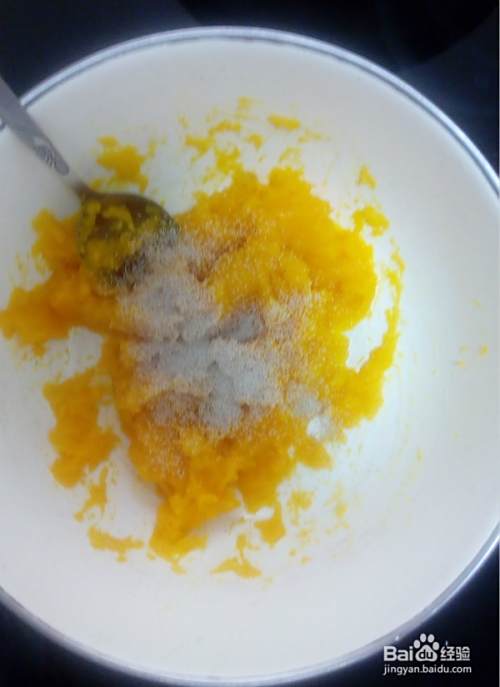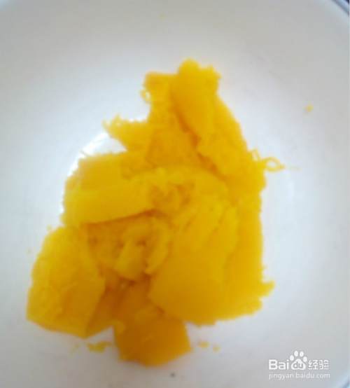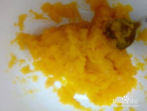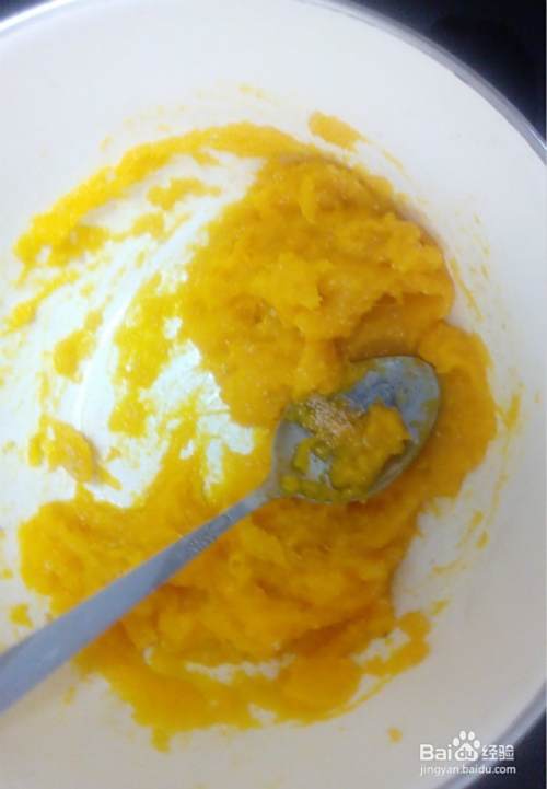 将蒸熟的南瓜压成南瓜泥。反复多压几次,南瓜泥会变得湿润细腻。