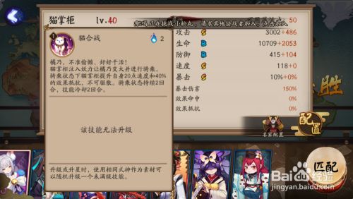 首先我们看看猫掌柜的面板属性,暴击速度和攻击都是S,而且自己看速度初始就是118,可见是一个可以先手的式神,而猫掌柜的第一个技能是对敌人造成80%的伤害,同时因为出动的猫咪不同,而附加的效果不同,比如黑猫有60%的概率减少鬼火一点,白猫可能会追加一次伤害,造成猫掌柜40%的伤害,而橘猫可能会击退对方20%的行动条,如果是在橘猫骑乘状态下还会额外造成伤害。