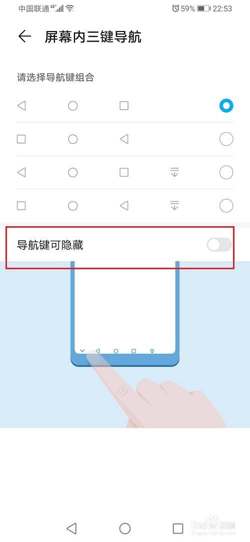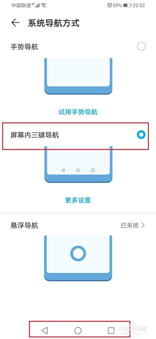 第四步进去之后,设置为屏幕内三键导航,华为手机下面的三个按键就出现了