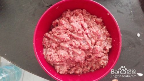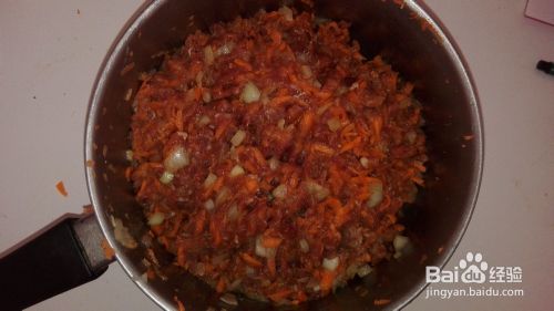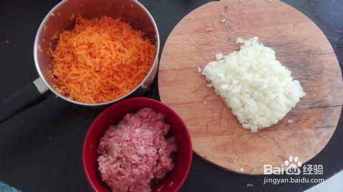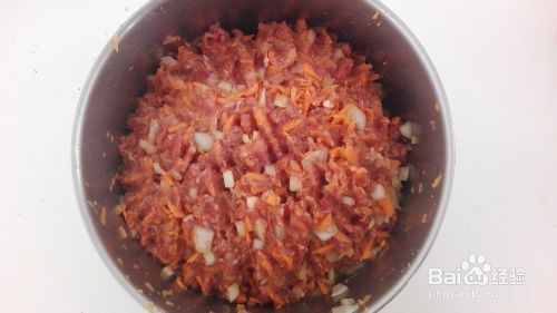 找一个比较大的容器,将肉馅放入其中,一边搅拌肉馅一边向其中分次数的加入之前切碎的洋葱,待洋葱搅拌完后,在逐渐加入胡萝卜馅,全部搅拌均匀后,再加些盐和油调一下味。