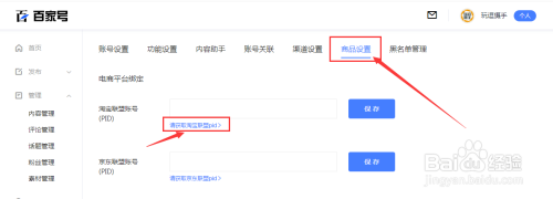 登录百家号,进入个人后台,下拉找到【账号权益】,点击【百家号设置】。跳转之后,点击进入【商品设置】之后,再点击【请获取淘宝联盟pid】跳转页面,【点击去备案并生成推广位】。