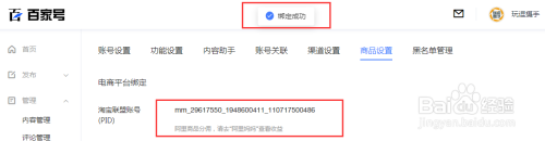 复制这一串mm开头的码,粘贴在【淘宝联盟账号(PID)】点击保存,百家号提示【绑定成功】。