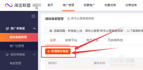 显示,您的备案填写完成,点击查看媒体管理。下一步,点击【推广位】,点击【新增推广位】填入信息,点击确定。此时,我们的推广PID码,出来了。