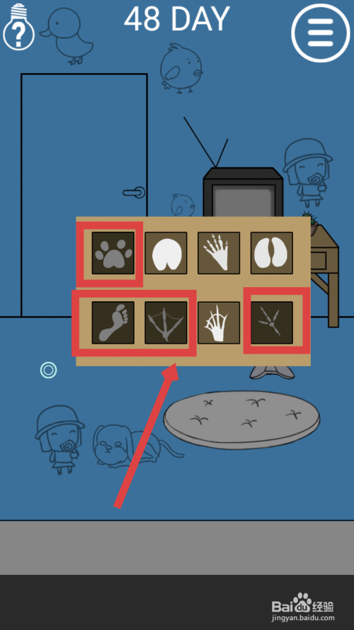 通过观察场景,能知道一共有人-狗-鸡-鸭四种生物。点击桌子左边的抽屉,选择人-狗-鸡-鸭对应的脚形状,就可以打开抽屉得到钥匙,使用钥匙开门。