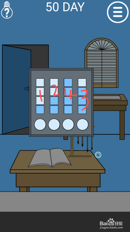 通过观察桌子上的毛笔架,根据毛笔的长度,从短到长顺序为1243。.点击门右边的方格,根据1243的顺序设置为蓝色的方格,就可以开门过关了。