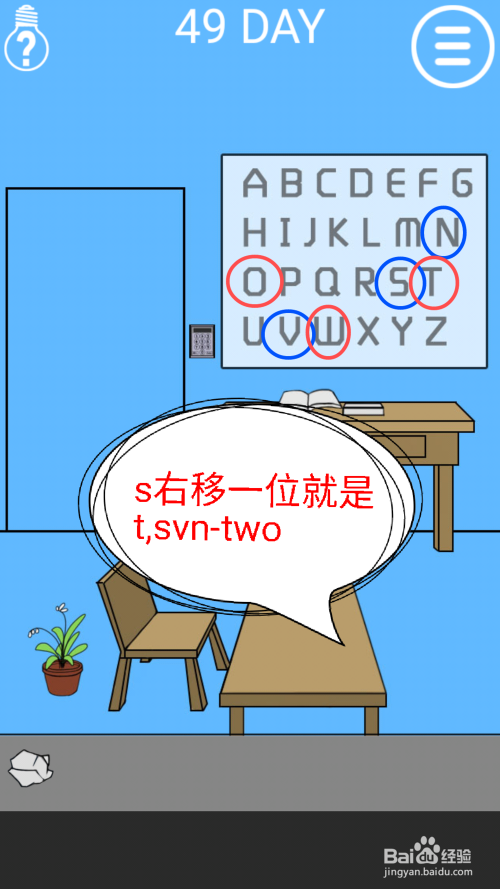 点击地上的白纸,双击得到的纸张,能看到上面的字母。对照着墙上的字母表,按照上面的英文字母往右移一位,能得到密码2645。点电子锁上面,输入密码,开门过关。