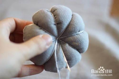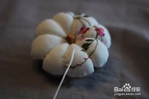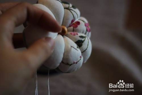 如下图所示,把线绕过针插的外围,把针从底布针眼的位置再戳回表布,同样的方法把针插用线分割成8份。一个漂亮的南瓜形状就出现了。这时候在底布打上一个小结再把针线戳回表布